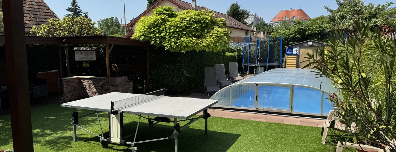 A kertben egy 3x7 méteres medence található (foglalásával elfogadja a medence használat szabályait), valamint trambulin, ping pong asztal és egyéb gyerekjátékok.